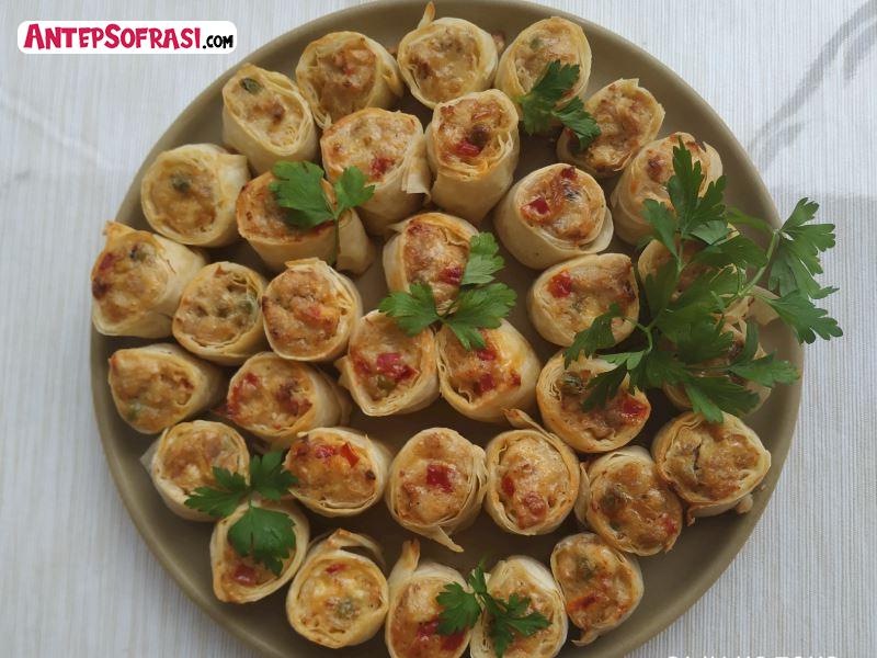 - Etli karışım yufkanın katlanan kenarına boylu boyunca koyulur ve yufka rulo sarılır.