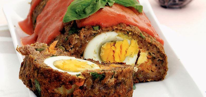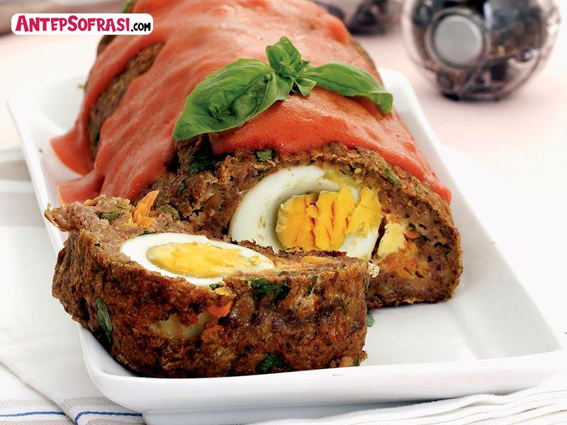 Kıymaları bir kaba alıp yoğurun. Ekmek içi, maydanoz, soğan, kimyon, 2 yumurta, tuz ve karabiberi ilave edip yoğurmaya devam edin. Köfteli harcını düz bir zemin üzerine alıp dikdörtgen şeklinde açın. Ortasına yumurta ve havucu yerleştirin. Rulo şekline getirin. Fırın kabına yerleştirip önceden ısıtılmış 170 dereceye ayarlı fırında 35-40 dakika pişirin. Köftenin pişen suyunu bir kaba ayırın.