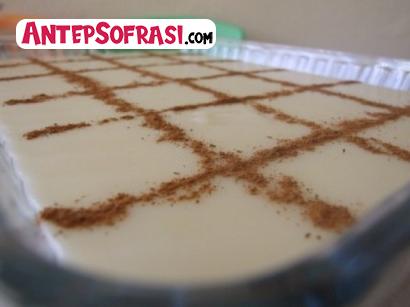 - Piştikten sonra mikserle çırpılır varsa topakları gider, hafif ıslatılmış tepsiye dökülür, soğuyunca afiyetle yenir.