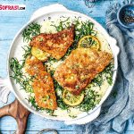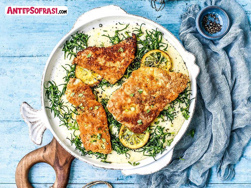 - Balıkları önce una iki taraflı bulayın, fazla ununu silkeleyin. Derisiz tarafını yumurtaya bulayın ve tarhanalı ekmek kırıntısı ile kaplayın. Az zeytinyağında yanmaz tabanlı bir tavada, alt-üst 3’er dakika yüksek ateşte yüzeyini kızartın. İçi pişmemeli!