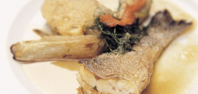 Rezeneyi temizleyip dilimleyin. Kalan zeytinyağını tavada ısıtın. Rezene ve sarımsağı ekleyip soteleyin. Levrek dolmasını servis tabağına alıp rezeneli sos ve portakal dilimleriyle süsleyerek servis yapın.