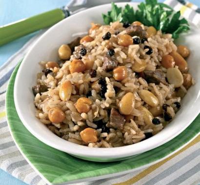 - Kalan tereyağını pilav tenceresinde eritip soğanı kavurun. Sırasıyla nohut, kuş üzümü, baharat ve haşlanmış eti ilave edin.