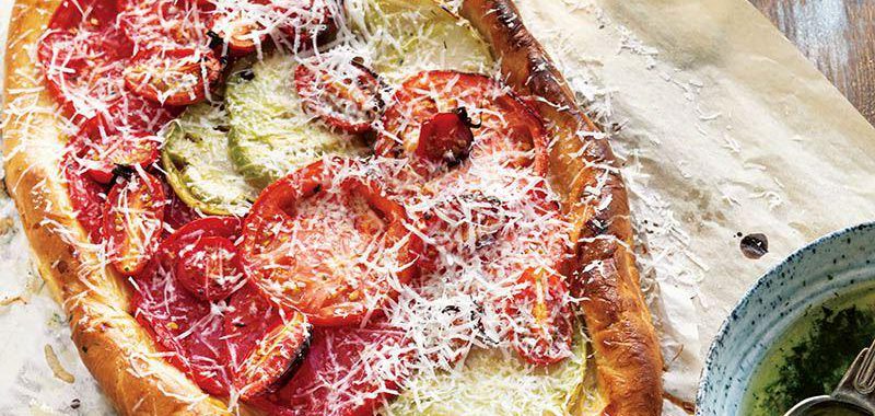 - Fesleğen yapraklarını zeytinyağı ile blender’den iyice geçirin. Açmış olduğunuz hamurun üstüne fesleğenli yağdan iyice sürün ve dilimlenmiş domatesleri düzgün şekilde yerleştirin. Kenarlarını katlayın ve yumurta sarısı sürün.