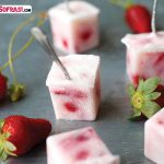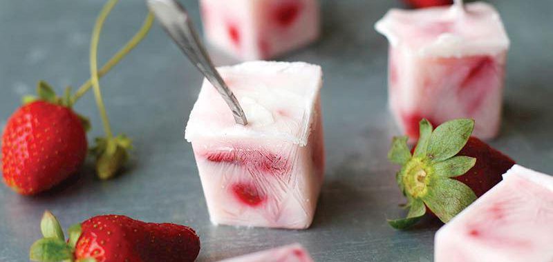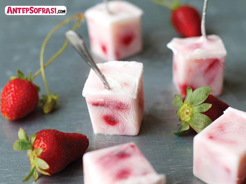 - Çilekleri rendeleyip ya da çok küçük şekilde doğrayıp yoğurt ile karıştırın. Karışımı buz kalıplarına doldurun. Derin dondurucuda 30 dakika beklettikten sonra her bir buz küpüne çay kaşıklarını saplayın. Dondurucuda bir gece boyunca bekletin.