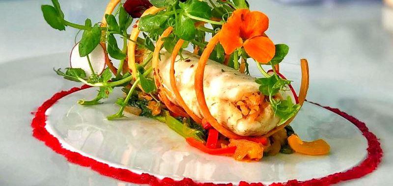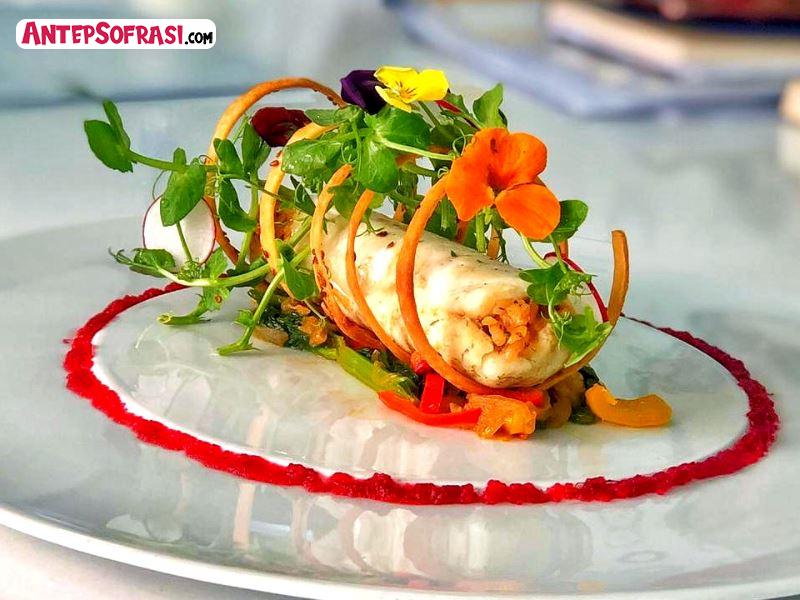 - Servis ederken altta ıspanak yatağı etrafında pancar püresi ve spiral kıtır hamur içinde levrek sarma yerleştirilir.