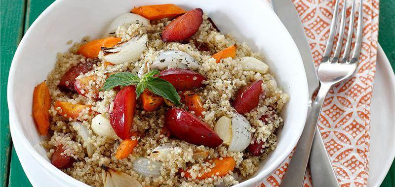 - Kinoayı tuzlu suda şişene kadar haşlayın. Fırında yumuşayan sebze ve meyveleri kinoa ile birleştirip son olarak kuru nanesini ve sirkesini de ekleyip karıştırın.