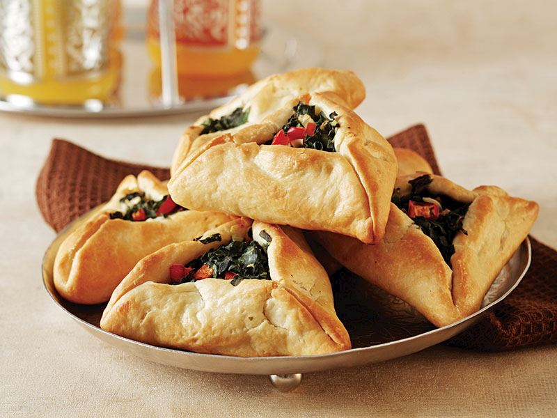 Bezeleri merdane ile çay tabağı büyüklüğünde açıp ortalarına ıspanaklı harçtan yerleştirin ve üçgen şeklinde kapatın. Yağlı kağıt serili tepsiye dizip üzerlerine süt sürün. 180 dereceye ayarlanmış fırında kızarıncaya kadar pişirin. Ilındıktan sonra servis yapın.