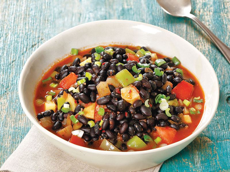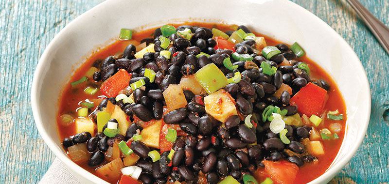 Siyah fasulyeyi akşamdan soğuk suda bekletin. Ertesi gün 10-15 dakika haşlayıp suyunu süzün. Tereyağını bir tencereye koyup eritin ve dövülmüş sarımsakları ekleyip kavurun. Ardından küp doğranmış domates, biber ve patatesleri tencereye ekleyin. Baharatları ve tuzu ekledikten sonra 15 dakika orta ateşte pişirin. Haşlanmış fasulyeleri de ilave edip, 15 dakika daha pişirin. Üzerini ince kıyılmış taze soğan ile süsleyerek sıcak olarak servis yapın.