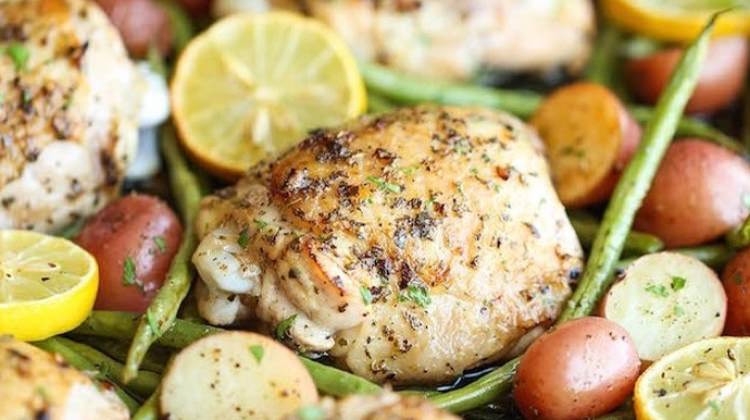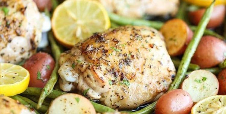 Fırını 200 derecede ısıtın. Fırın tepsisini hafif yağlayın. İkiye böldüğünüz patates ve ayıklanmış fasulyeleri yerleştirin. Tuz, biber ve kalan zeytinyağı ilave edin. Tavuk parçalarını da tepsiye alın.