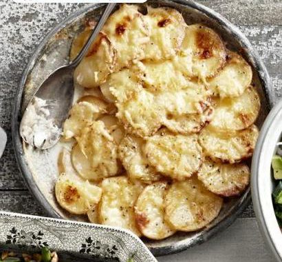 Patatesleri ince daireler halinde dilimleyin. Bir tencerede krema, süt, peynirin yarısını ve tereyağını ıstın. Patatesleri bir fırın tepsisine dizin...