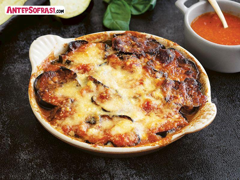 - Fırına girecek kaplara önce patlıcan dilimini yerleştirin ve üzerine domates sos ile dilimlenmiş mozzarella peyniri ve bir adet fesleğen yaprağı koyun. Aynı işlemi tekrarlayın. En üste yine bir kat daha patlıcan koyun ve sostan ekleyin. Son olarak toz parmesan peynirini serperek 180 derece ısıtılmış fırında 20-25 dakika pişirin ve sıcak servis edin.