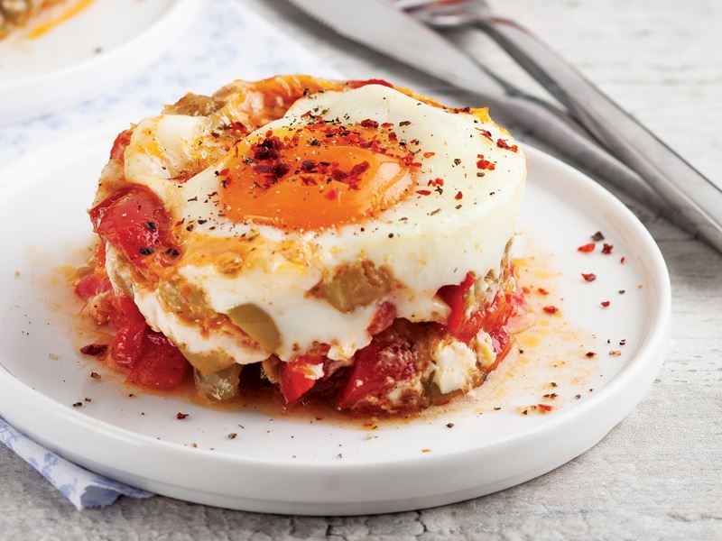 Küp doğradığınız biberler ve domatesleri zeytinyağında hafif diri kalacak şekilde tuz ve karabiberle tatlandırarak soteleyin. Sotelediğiniz sebzeleri fırına dayanıklı muffin kaplarına paylaştırın. Üzerlerine birer yumurta kırıp önceden ısıtılmış 200 derece fırında yumurtalar pişene kadar 8-10 dakika pişirip fırından alın. Üzerine kırmızı pul biber serperek sıcak servis yapın.