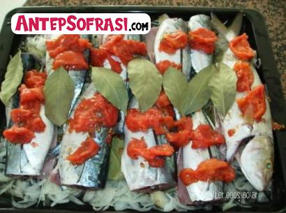 - Balıkların her biri üzerine birer dilim de domates yerleştirildikten sonra orta ısılı fırında suyu tamamiyle çektirilmeden yarım saat kadar pişirilir.