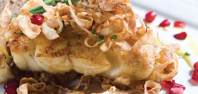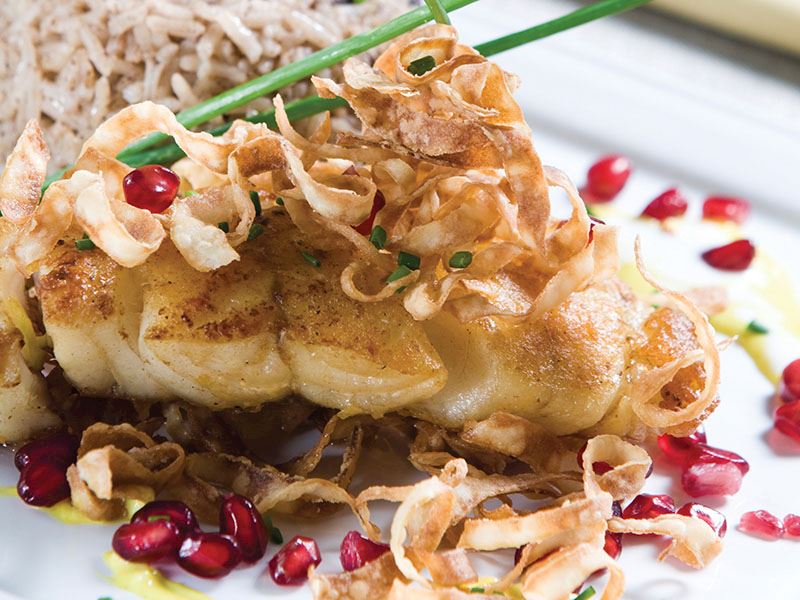 Sosu balığın üzerine dökün. Nar taneleri, kızarmış soğan, frenksoğanı ve zahtare ile süsleyerek servis yapın. Kızarmış soğan dilimleri için Yarım soğanı yuvarlak dilimleyin. 1 yumurtayı bir kabın içinde çırpın. Her soğan dilimini önce yumurtaya sonra una batırıp ayçiçeği yağında kızartın.