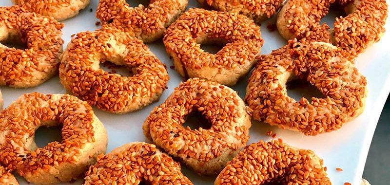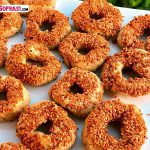- Hamurdan parçalar koparın, simit şeklini verin. Önce yumurta akına, sonra susam veya çörek otuna batırın. 160 derece fırında pişirin.