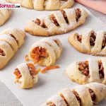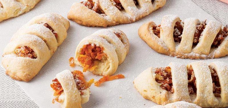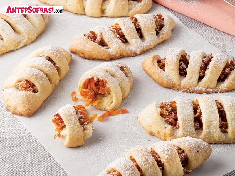 - Yuvarlakların kenarlarını koparmadan, bıçak ile çizikler atın. Üzerlerine havuçlu iç harcından koyun ve karşılıklı kenarları ortada birleştirip kapatın. Kalan hamurlara da aynı işlemi tekrarlayın. Kurabiyeleri yağlı kağıt serili fırın tepsisine dizin. Önceden ısıtılmış 170 derece fırında 20-25 dakika pişirin. Fırından alıp ılınmaya bırakın. Üzerlerine pudra şekeri serperek servis yapın.