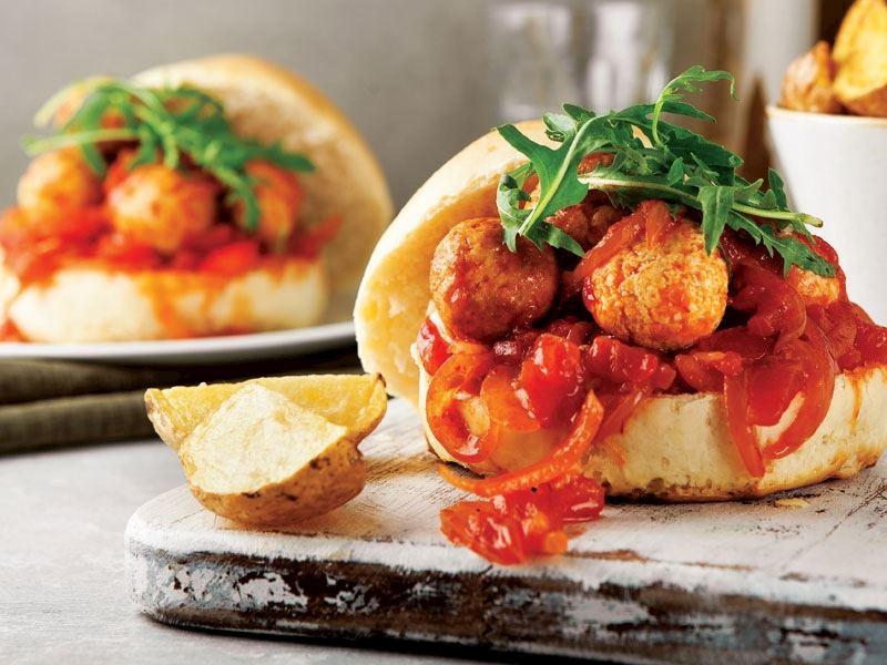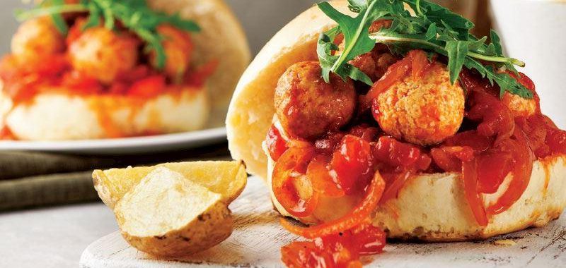 Hindi kıymayı geniş bir yoğurma kabına alın. Rezene tohumu ve limon suyunu ekleyip yoğurun. Kıymalı harçtan 12 adet yuvarlak köfte hazırlayın. Zeytinyağını yapışmaz yüzeyli bir tavaya alarak ısıtın. Köfteleri hafifçe kızartıp kağıt havlu üzerine alarak yağını çektirin. Köfteleri kızarttığınız tavaya piyazlık doğranmış soğan, rendelenmiş sarımsak, julyen doğranmış kırmızıbiber ve küp doğranmış domatesi ekleyin. Toz şekeri ekleyip karıştırarak pişirin. Daha sonra kızartığınız köfteleri ilave edip 15 dakika daha pişirin. Garnitürü için, elma dilimi şeklinde doğradığınız patatesleri yağlı kağıt serili fırın tepsisine alın. Üzerine zeytinyağı gezdirip önceden ısıtılmış 180 derece fırında 25 dakika pişirin. Hamburger ekmeklerinin içine hazırladığınız soslu köfteden koyup roka ile süsleyerek servis tabağına alın. Yanında fırınlanmış patatesle birlikte servis yapın.
