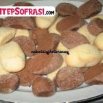 - Yoğurma kabına oda sıcaklığında yumuşamış margarini, pudra şekerini, yumurta akını ve vanilya alıp karıştırın. Un ve kabartma tozunu ilave edip yoğurun. Kakaolu yapmak isterseniz hamurun yarısına kakao ekleyip yoğurun. Ben öyle yaptım. Yoğurduğunuz hamuru 3 parçaya ayırıp her birini uzun rulo yapın. 1 su bardağı toz şekeri bir tepsiye dökün ve ruloları şekere bulayın ve bir santim olacak şekilde kesin (resimde görüldüğü gibi). Yağlanmış fırın tepsisine dizin önceden ısıtılmış fırında beyaz kalacak şekilde pişirin. Benimkiler biraz fazla kızardı.