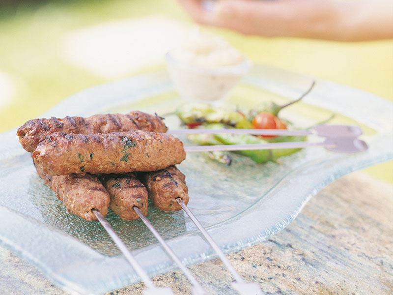 - Köfte için, bulgur, kıyma, soğan, yenibahar, sarımsak, bayat ekmek ve çırpılmış yumurtayı bir kapta iyice yoğurun. Bu karışımı 12 parçaya bölün ve şişlerin etrafına sarıp ızgarada pişirin.