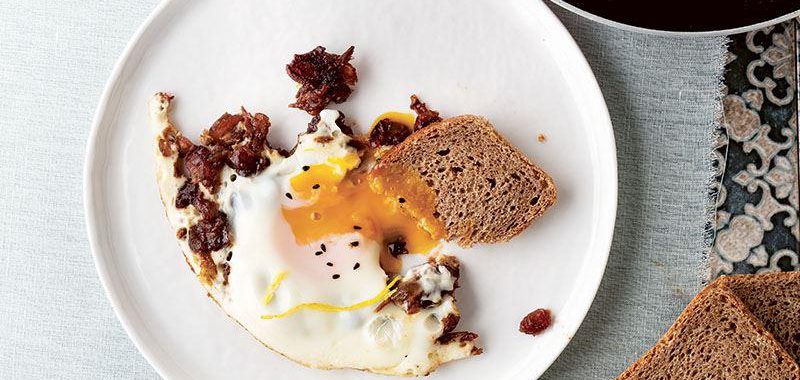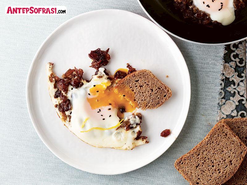 - Hurmaları ince doğrayın. Tavada yağı eriterek, su ve hurmaları ilave edin. Yumuşayıncaya kadar pişirin. Aralarını açarak yumurtaları kırın. Üzerine çörek otu ile limon kabuklarını serpip tavanın kapağını kapatın. Yumurta akları beyazlayıncaya kadar pişirin ve bekletmeden servis yapın.