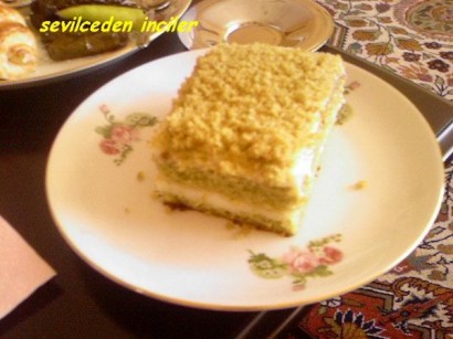 - yeşil fıstık ezmesi veya kekin kendisinden ufalayarak süslüyoruz.