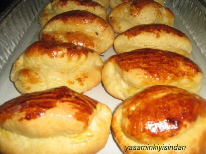 - MALZEME:3 yumurta(birinin sarısı ayrılacak üzeri için) 1 paket margarin (oda sıcaklığında 1 kg un 1 tatlı kaşığı tuz 1 yemek kaşığı şeker 1 paket yaş maya Ilık su İÇ MALZEME: 200 gram beyaz peynir MaydanozYAPILIŞI: Unu yoğurma kabına alalım.Ortasını havuz gibi açalım..Ortaya maya ve yarım su bardağı kadar ılık su ve şekeri koyup mayayı eritelim..Maya eriyince margarin tuz ve yumurtaları ilave edip yoğuralım..Orta yumuşaklıkta bir hamur yoğuralım ılık su takviyesiyle..Yoğurduğumuz hamuru ılık bir yerde üstü kapalı olarak iki katıolana kadar bekletelim..Mayalanan hamurumuzdan yumurta büyüklüğünde parçalar alıp şekil verelim..içine dilediğimizi koyalım..Ben pey