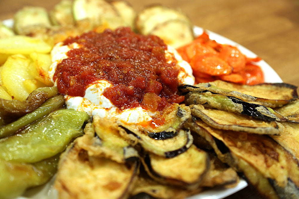 Önce patlıcanlar, sonra kabaklar ve biberler kızgın yağ içinde kızartılıp servis tabağına alınır.