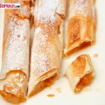 - Hazırladığınız içi, üst üste dizdiğiniz hamurun en üst katına, kenarlarından 2.5 cm içeriye olacak şekilde yayın ve hamuru döndürerek rulo yapın. Rulonuzun üzerine fırçayla tereyağı sürün. Isıtılmış fırında 15-20 dakika pişirin. Kayısılı ve armutlu ruloların üzerini pudra şekeriyle süsleyip ince ince keserek sıcakken servis yapın.