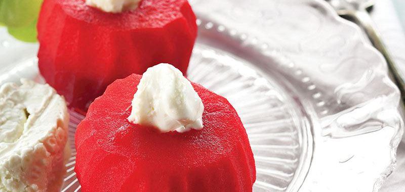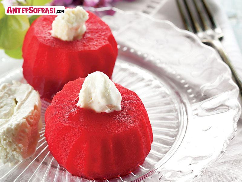 Elmaların kabuklarını soyun ortasındaki çekirdekleri meyve oyacağı ile çıkarın. Elmaları küçük bir tencereye oyuk kısımları üste gelecek şekilde dizin. Su, şeker, vişne suyu ve karanfil ekleyerek tencerenin kapağını kapatın. Buzdolabında bu şekilde 1 gün bekletin. Tencereyi ocağa alıp 30 dakika elmaları pişirin. Şerbetini süzerek servis tabaklarına paylaştırın. Oyuk kısımlarını kaymakla doldurup servis yapın.