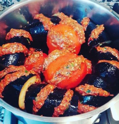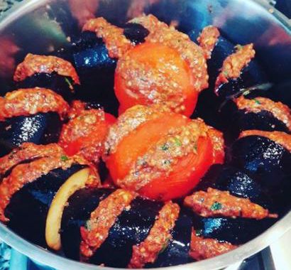 - Patlıcanların aralarına kıymalı harçtan doldurun.