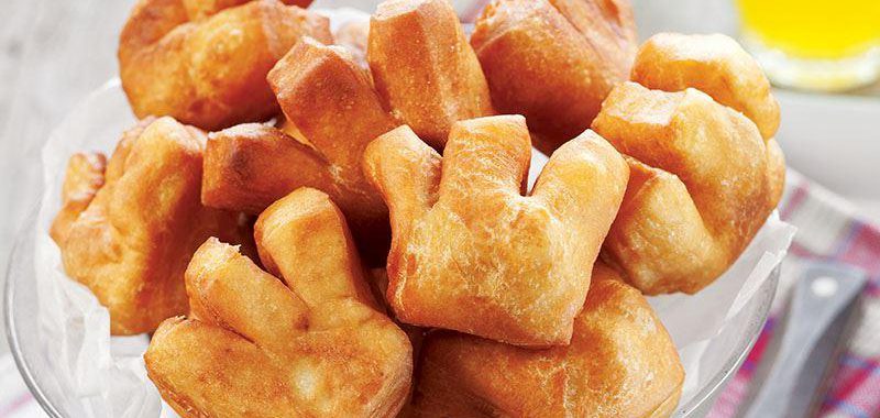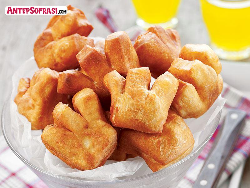 Un, yumurta, yoğurt, tuz ve karbonatı çukur bir kapta yoğurun. Yumuşak kıvamlı bir hamur elde edin. Un serptiğiniz mutfak tezgahında hamuru açın. 2 parmak eninde uzun şeritler kesin. Kestiğiniz şeritlerden 6-7 cm uzunluğunda dikdörtgenler elde edin. Her bir parçanın uzun kenarına iki kesik atın. Ayçiçeği yağını derin bir tavada iyice ısıtın. Isınan yağda hamurları kızartıp kağıt havlu üzerine alın. Sıcak servis yapın.