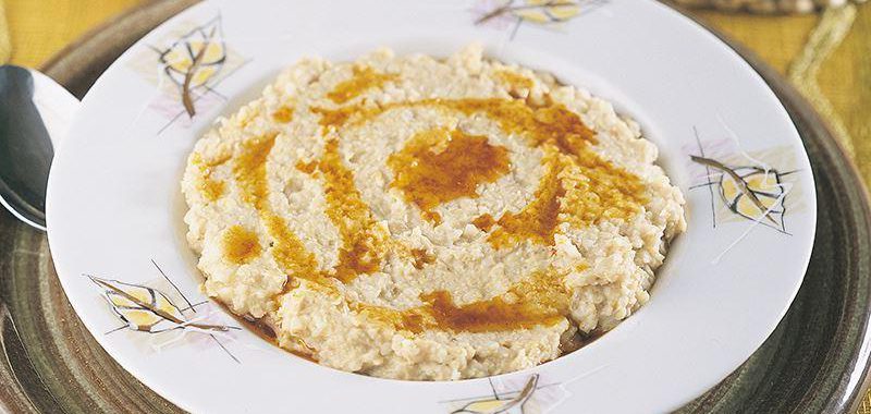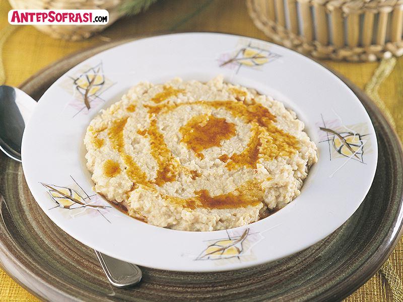 Dövme ve nohudu akşamdan 2.5 bardak su ile ıslatın. Eti basınçlı tencereye alın. Nohut ve dövmeyi süzüp sularını ayırın ve malzemeyi tencereye ekleyin. Islatma suyunu 4 su bardağına tamamlayın. Margarinin yarısını su, karabiber ve tuzu ekleyip dövme lapalaşıncaya kadar 75 dakika pişirin.