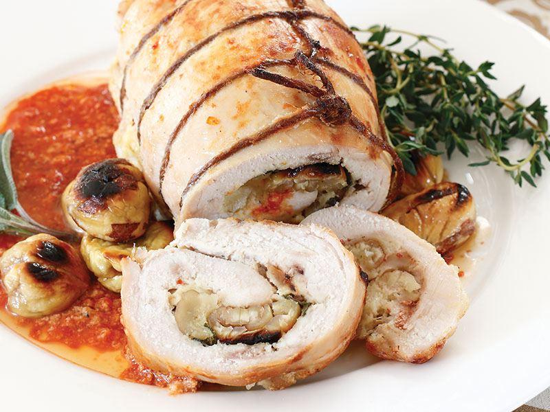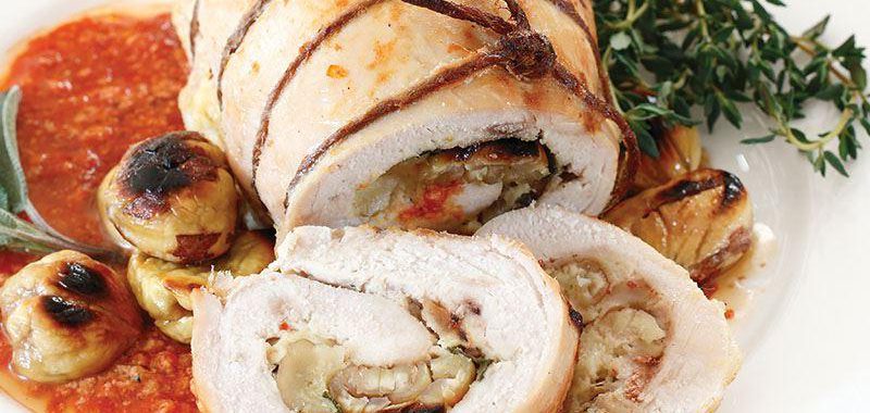 Fırını 200 dereceye ayarlayın. Hindi göğüs filetoyu bir et dövücüyle inceltin. Üzerine zeytinyağı asürüp tuz ve karabiber serpin. Tereyağını tavaya alıp eritin. Adaçayı, dilimlenmiş sarmısakları ve kavrulmuş kestaneleri ekleyip birkaç dakika kavurun. Tavayı ocaktan alıp harcı ılındırın. Ekmek içi, lor peyniri, parmesan peyniri, yumurta, tuz ve karabiberi büyük bir kaseye alın. Kestaneli harcı ekleyip karıştırın. Hindi filetonun üzerine yayın. Eti rulo şeklinde sarın ve mutfak ipiyle açılmayacak şekilde bağlayın. Etin üzerine zeytinyağı sürün. Fırın tepsisine yağlı kağıt serip rulo hindi etini üzerine yerleştirin. Domates püresini biraz zeytinyağı ve su ile inceltip etin üzerine gezdirin. Üzerini alüminyum folyo ile kapatıp 200 derece fırında 30 dakika pişirin. Fırın ısısını 180 dereceye indirip üzerindeki folyoyu alın ve 20 dakika daha pişirin. Dilimleyip servis yapın.