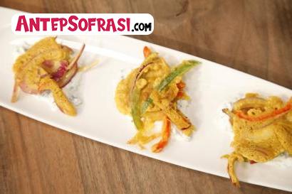 Kırmızı soğanları ince ince piyazlık doğrayın. Derin bir kasede nohut unu,kabartma tozu,toz köri,ince kesilmiş kırmızı ve yeşil biberleri karıştırın. ...