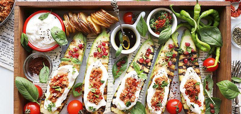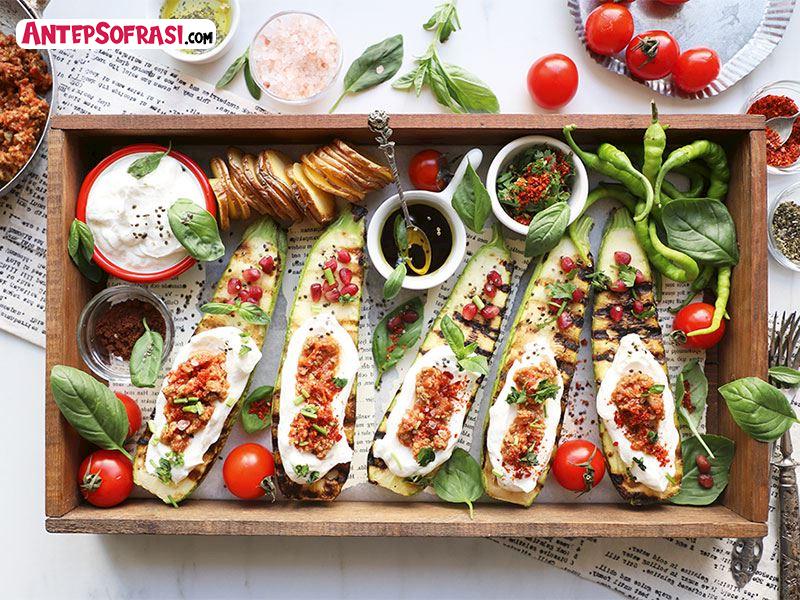 - Süzme yoğurt ve doğal yoğurdu krema kıvamında çırpın. Izgara kabakların üzerine önce yoğurdu sonra da kıymalı harcı yayın. Taze yeşillik, kıl biber ve domateslerle birlikte servis edin.