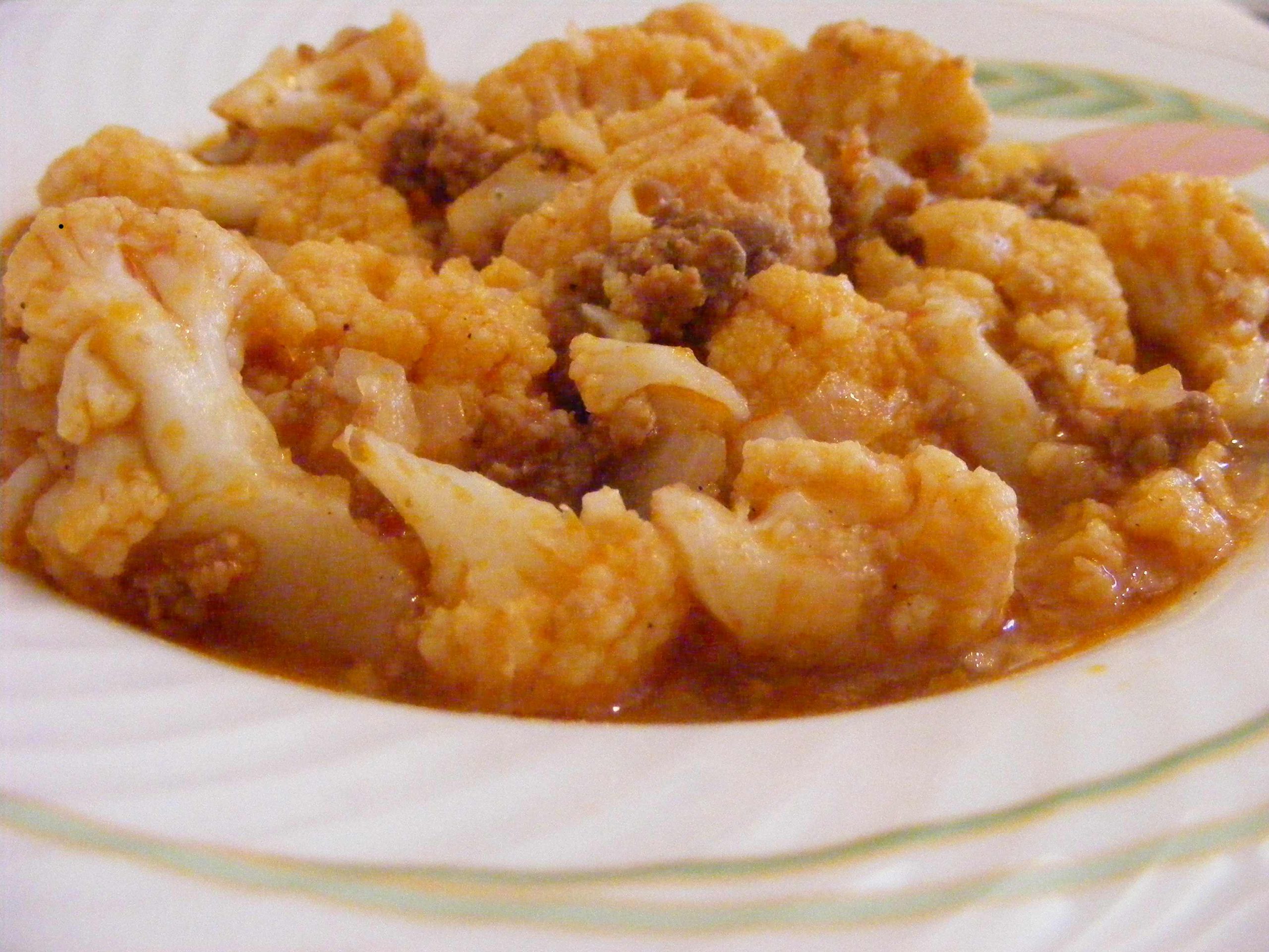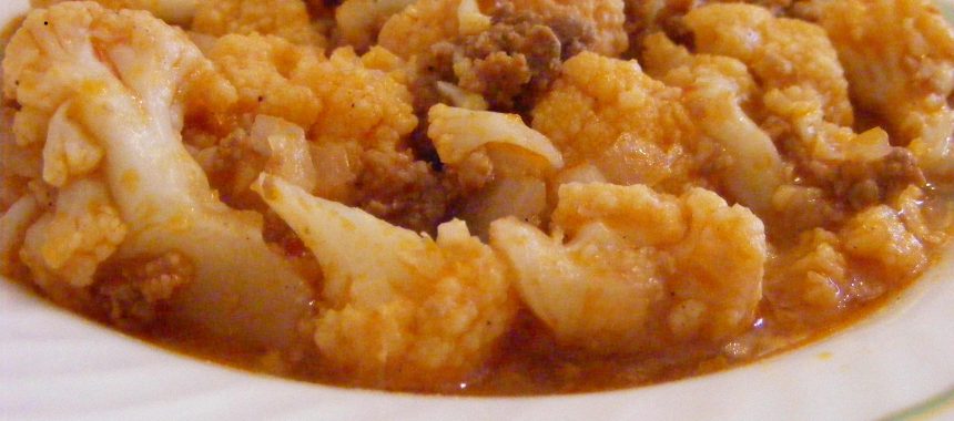 Karnabahar ve tuz, kıyma üzerine atılarak 2 dakika çevrildikten sonra, salça da ilave edilip 2 dakika daha çevrilir.
