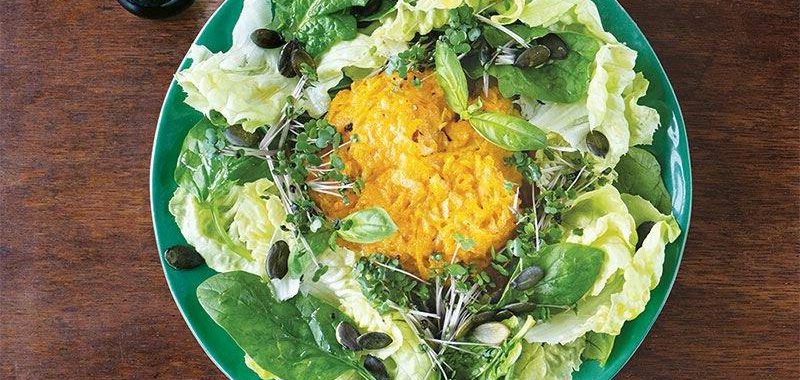 - Kızarttığınız balkabağı çanaklarını ters olarak salatanın ortasına yerleştirin. Üzerini mikro filiz ve balkabağı çekirdeği ile süsleyerek servis edin.