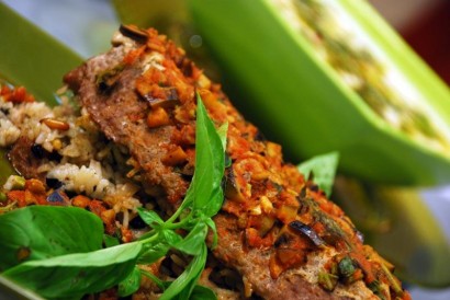 - İçine iç pilavdav ekleyin.Kalan köfteyi kek kalıbının üzerine