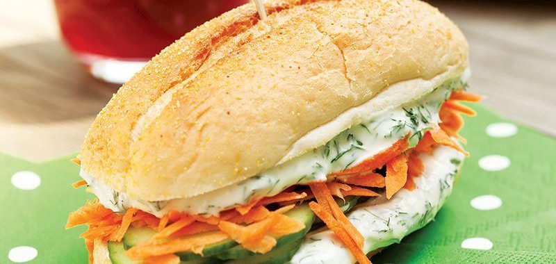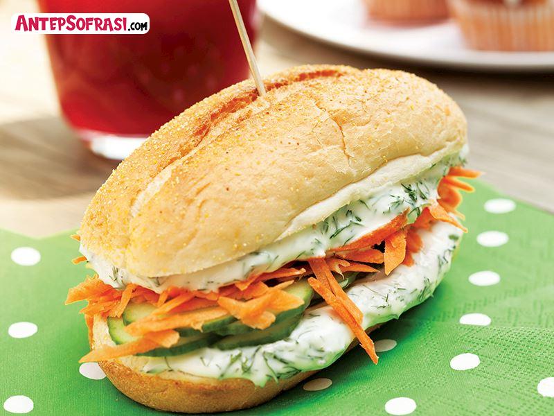 Dereotunu ince kıyıp krem peynirle karıştırın. Ekmekleri enlemesine ortadan ikiye kesin. İç kısımlarına krem peynir sürün. Havuçları irice rendeleyin. Tuz, limon suyu ve zeytinyağı ekleyip karıştırın. Salatalıkları iyice yıkayıp kabuklarını soymadan ince doğrayın. Salatalık dilimlerini ve rendelenmiş havuçları ekmeklerin arasına yerleştirip kapatın. Servis yapın.