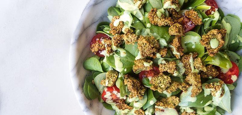 Demir, kalsiyum, C vitamini ve Omega 3 bakımından zengin semizotu salatasına bademli kruton ve taze otlu peynir sosuyla hem renk hem de lezzet katın.