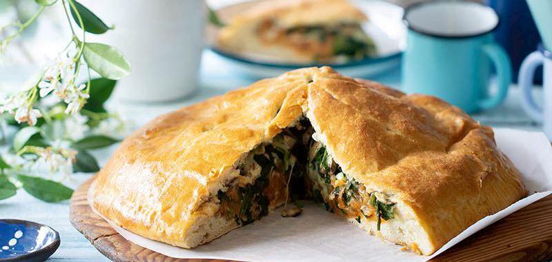- İkinci hamuru da un serpilmiş tezgahın üzerinde açın. Bir önceki hamurdan 2 cm daha büyük olacak şekilde kesin. İlk katın kenarlarına yumurta akı sürün. İkinci kat hamuru malzemenin üzerine kubbe olacak şekilde kapatın ve kenarlarını da çatalla bastırarak açılmamasını sağlayın.