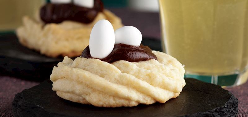 Hamuru için gerekli olan tüm malzemeyi geniş bir yoğurma kabına alın. Tüm malzeme iyice özdeşleşinceye kadar yoğurun. Hamurdan küçük parçalar kopartıp sarımsak sıkacağı ile yağlı kağıt serili fırın tepsisine yuvarlaklar sıkın. Hamurların ortalarına parmağınızla bastırıp çukurlaştırın. önceden ısıtılmış 200 derece fırında 10-12 dakika pişirin. üzeri için bitter çikolatayı tereyağı ile birlikte benmari usulü eritin. Sütü ilave edip karıştırın. Pişen kurabiyelerin ortasına bir kaşık yardımıyla sütlü çikolatadan doldurup badem şekeri ile süsleyin. çikolatanın donması için bir süre oda sıcaklığında beklettikten sonra servis yapın.