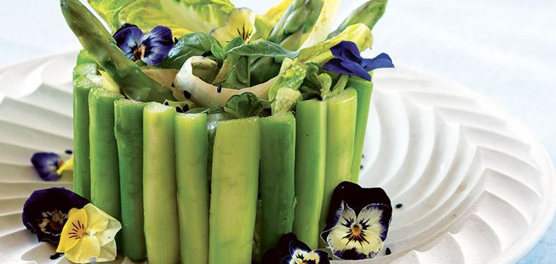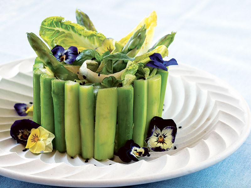 - Dikkatli bir şekilde çemberden sunum tabağına aldığınız salatanızın üstüne kuşkonmaz uçlarını ekleyin. Çörek otu ve yenilebilir çiçekle süsleyerek servis edin.
