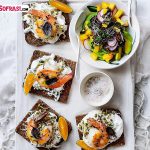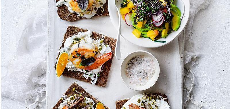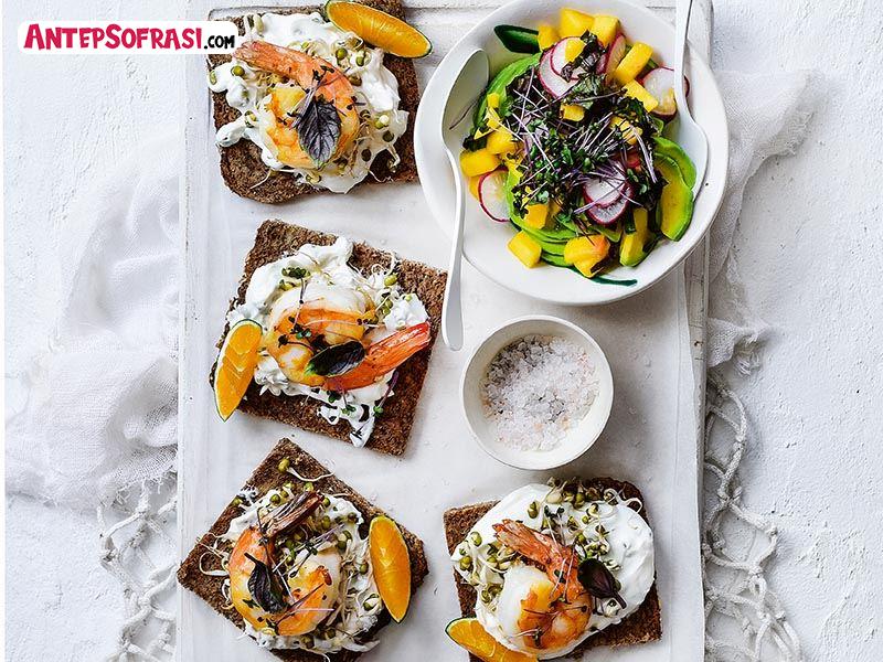 - Karidesleri alt-üst zeytinyağında toplam 4 dakikada pişirin. Süzme yoğurdun içine maş fasulyesini koyup karıştırın ve ekmeklere paylaştırın. Üzerine karidesleri koyun, reyhan yaprağı ekleyin ve salsa ile birlikte servis edin.