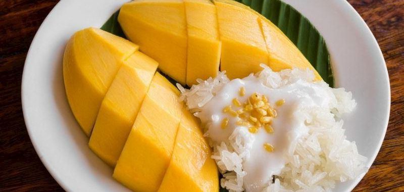 - Mangonun yanına yapışkan pirinç ekleyin ve üzerine hindistan cevizi sosu gezdirin.