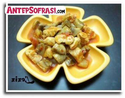 Tavuk eti,mantar,domates ve biber küp şeklinde doğranır. Tencereye 2 yemek kaşığı sıvıyağ konulur. Küp şeklinde doğranımş tavuk eklenerek,kendi suyunu...