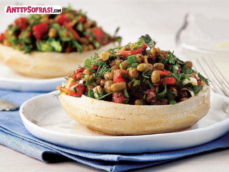 Enginarları yayvan bir tencereye dizin. Limon suyu, zeytinyağı ve tuzu bir kasede karıştırıp enginarların üzerine gezdirin. Suyunu ilave edip kapağı kapalı olarak enginarlar tamamen yumuşayıncaya kadar pişirin. Üzeri için haşlanmış maş fasulyesini geniş bir karıştırma kabına alın. Küp doğradığınız közlenmiş kırmızı biber ve ince kıydığınız yeşillikleri ilave edin. Zeytinyağını ilave edip tuz ve baharatlarla tatlandırın. Pişen enginarları bir servis tabağına alın. Maş fasulyeli harcı üzerlerine paylaştırıp servis yapın.