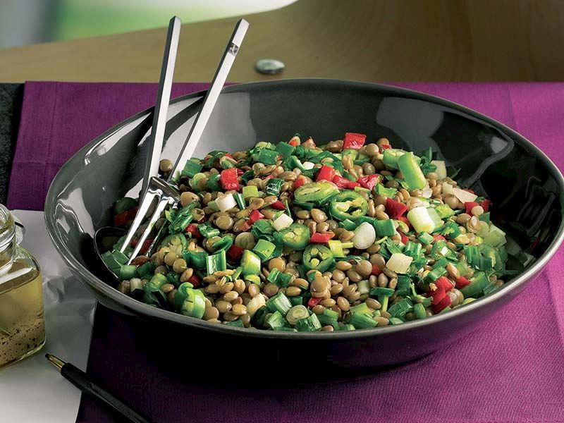 - Sosu için gerekli olan tüm malzemeyi bir kasede karıştırın. Ilınan mercimeğin üzerine döküp sosu çekmesi için karıştırın. Sivri biber, kırmızı biber, taze soğan ve maydanozu ince kıyıp mercimeğin üzerine ilave ederek tekrar karıştırın. Tuz ve kırmızı pul biber ile tatlandırıp servis yapın.