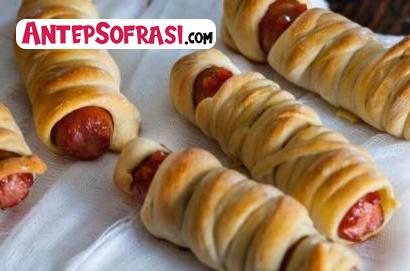 Milföy hamurlarini 1 cm lik şeritler halinde kesin. Parmaklarınızla uzatarak biraz inceltin. Sosisleri 1 parmak uzunluğunda kesip iyice kurulayın. Mi...