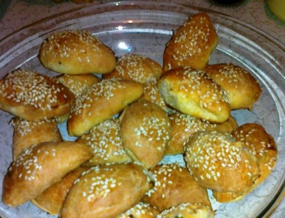 - un hariç tüm malzemeleri iyice karıştıralım yavaş yavaş un ekleyelim ele yapışmayacak bir kıvamda olunca ufak ufak kopartıp iç malzemeleri koyup kapatalım.üzerine yumurta sarısı ve susam serpip fırında 20 dakika kadar pişirelim